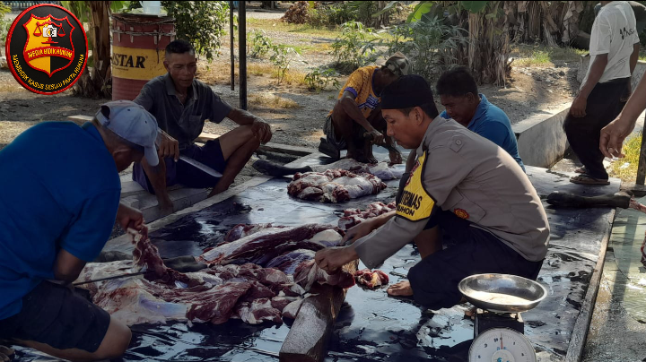 Di tengah kegiatan itu, Bhabinkamtibmas Polsek Nuhon Bripka Samsul Huda, juga turut serta membantu secara langsung proses penyembelihan hewan kurban.