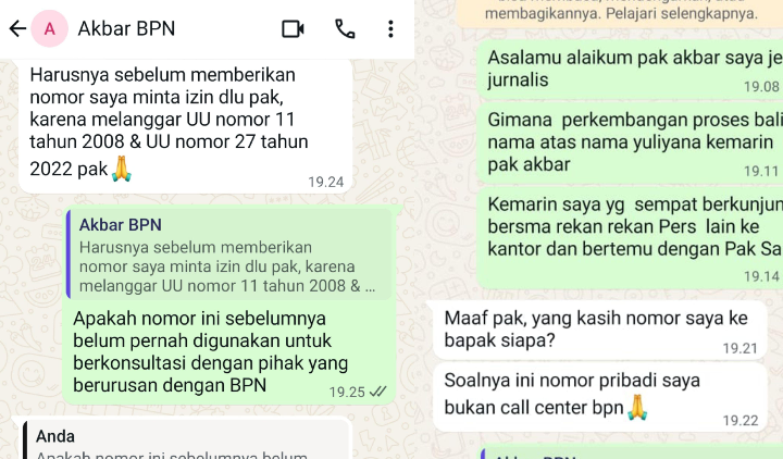 “Maaf, ini yang kasih nomor ke bapak siapa? Soalnya ini nomor pribadi saya, bukan call center BPN. Seharusnya sebelum memberikan nomor saya, minta izin dulu pak, karena melanggar UU Nomor 11 Tahun 2028 dan UU Nomor 27 Tahun 2022,” tulisnya dalam pesan.