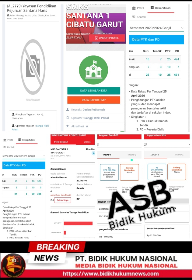 Garut, Cibatu – bidikhukumnews.com Dugaan ketidaksesuaian data jumlah siswa antara sistem ARKAS dan Data Pokok Pendidikan (Dapodik) di SMKS Santana 1 Cibatu, Kabupaten Garut, kian menguat. Perbedaan data tersebut tidak hanya menimbulkan persoalan administratif, tetapi juga berpotensi berdampak pada keuangan negara hingga ratusan juta rupiah. Sabtu, 25/04/2026.