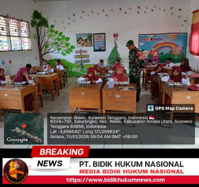 Babinsa Koramil 1412-08/Ranteangin, Praka Ismail, melaksanakan kegiatan pemantauan dapur serta pendampingan penyaluran Makan Bergizi Gratis (MBG) kepada sekolah-sekolah se-Kecamatan Wawo, Selasa (13/1/2026).