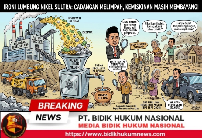KENDARI Sulawesi Tenggara – bidikhukumnews.com || Di tengah ambisi global menuju era kendaraan listrik, Provinsi Sulawesi Tenggara (Sultra) semakin mengukuhkan posisinya sebagai “jantung” nikel nasional. Sebagai bahan baku utama industri baterai dunia, nikel Sultra adalah aset strategis yang diperebutkan. Namun, di balik gemerlap investasi hijau tersebut, sebuah ironi besar masih menyelimuti: kekayaan alam yang melimpah belum sepenuhnya mampu memutus rantai kemiskinan di bumi anoa.