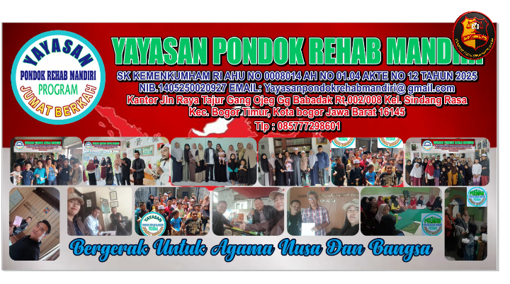 Dengan berdirinya,” Yayasan Pondok Rehab Mandiri,” Sekertariat yang beralamat: Jln. Raya tajur ,Gang Ojeg Babadak Rt: 002/008, Kel: Sindang Rasa, Kec: Bogor Timur, Kota Bogor.” karena tergerak untk melakun kegiatan berbagi dan keperdulian ini InsaAllah akan dilakukan setiap hari jumat dalam program JumAt berkah, terima kasih banyak atas bantuan para donatur ,elemen msyarakat dan organisasi mayarakat yang telah terlibat secara langsung maupun tidak langsung, dan semoga tidak bosan untuk melakukan kebaikan .