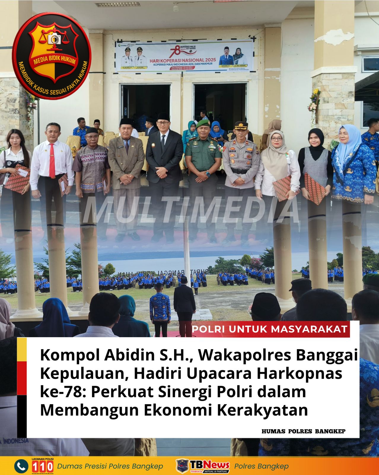 Banggai Kepulauanbidikhukumnews.com || Kepolisian Resor Banggai Kepulauan (Polres Bangkep) menunjukkan komitmennya dalam mendukung pembangunan ekonomi kerakyatan dengan kehadiran Wakapolres Banggai Kepulauan Kompol Abidin S.H. dalam Upacara Peringatan Hari Koperasi Nasional (Harkopnas) ke-78 Tahun 2025. Acara yang mengusung tema “Koperasi Maju Indonesia Adil Makmur” ini berlangsung khidmat di Halaman Kantor Bupati Banggai Kepulauan pada Senin pagi, 14 Juli 2025.