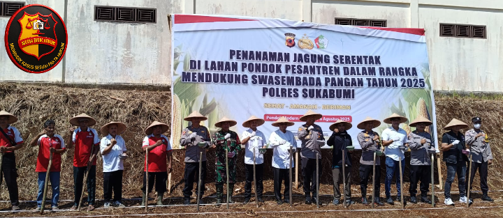 Sukabumi – bidikhukumnews.com || Dalam rangka mendukung program swasembada pangan tahun 2025, Polres Sukabumi bersama stakeholder terkait menggelar kegiatan penanaman jagung secara serentak di lingkungan Pondok Pesantren As-Salam, Kecamatan Warungkiara, Kabupaten Sukabumi, Rabu (6/8/2025).