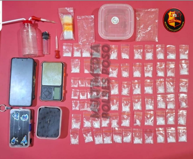 “Setelah tersangka diamankan, kami melakukan penggeledahan dan menemukan 71 paket plastik bening berisi sabu-sabu dengan berat bruto 63,56 gram siap edar,” jelasnya.
