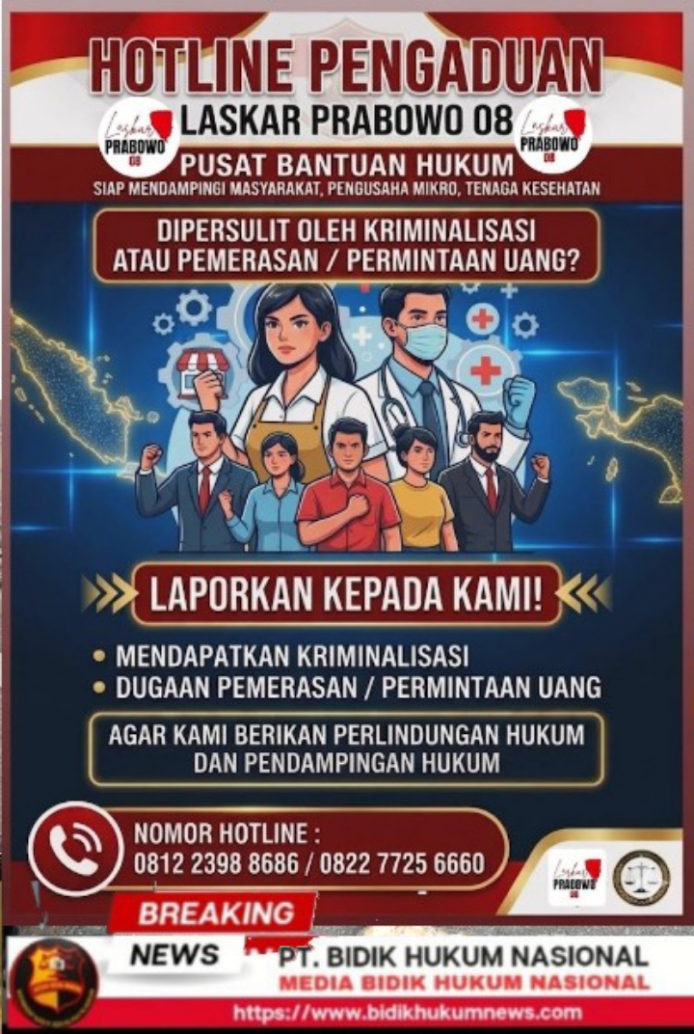 Masyarakat yang mengalami kendala hukum dapat menghubungi Hotline Pengaduan Laskar Prabowo 08 di nomor: